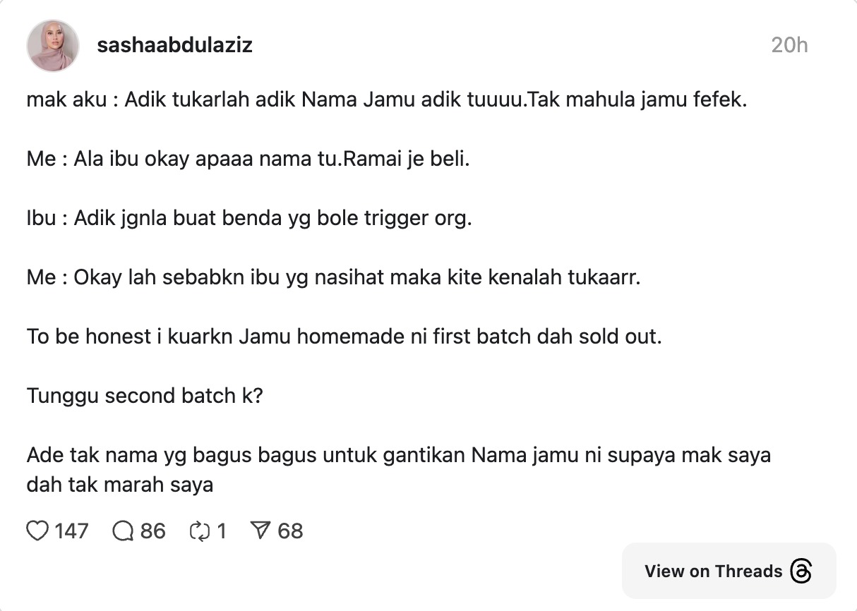 Menerusi satu hantaran di Threads, Sasha berkongsi bahawa ibunya menasihatinya supaya menukar nama jamu tersebut kerana perkataan yang digunakan dianggap tidak sesuai dan berpotensi mencetuskan rasa kurang senang dalam kalangan masyarakat.